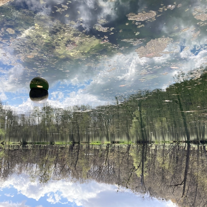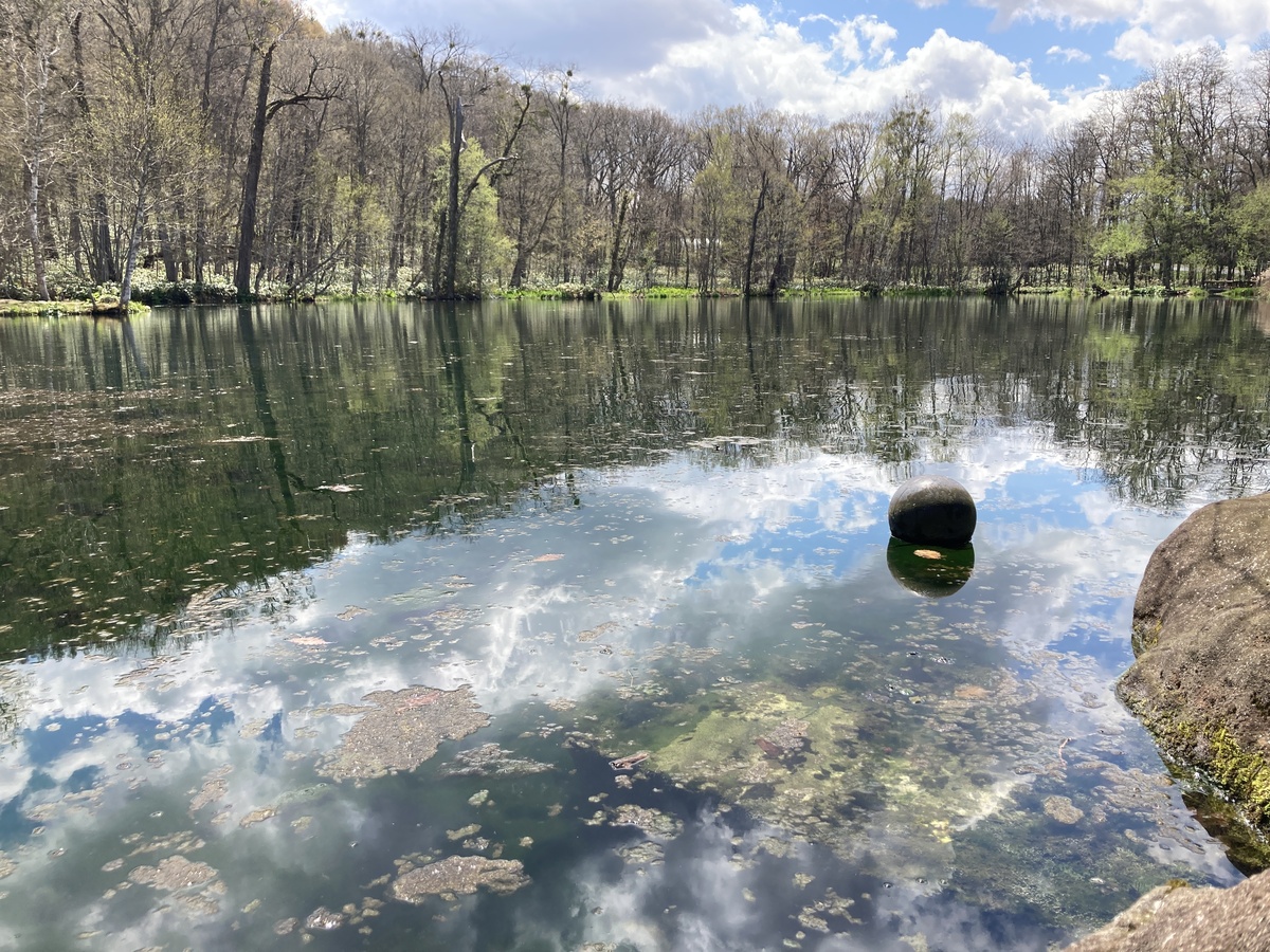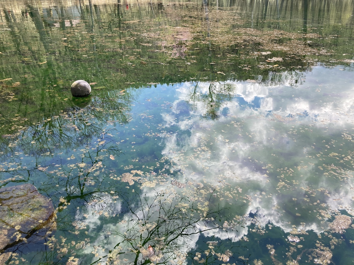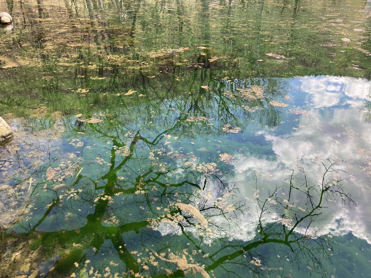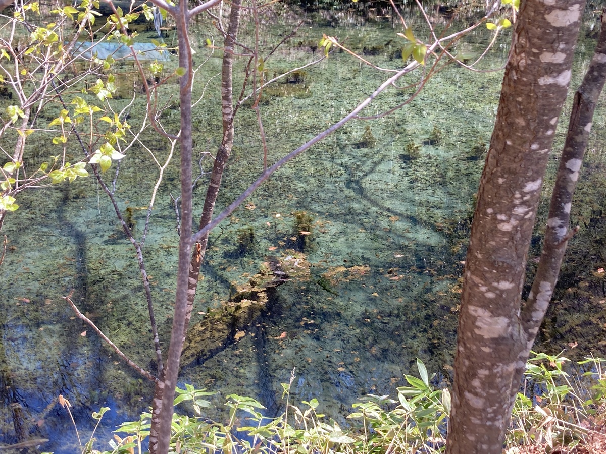 沼の水は湧水で透明度が非常に高く、底の緑が見えるほど澄んでいます。魚もいますが、この日はあまり姿を見せず。