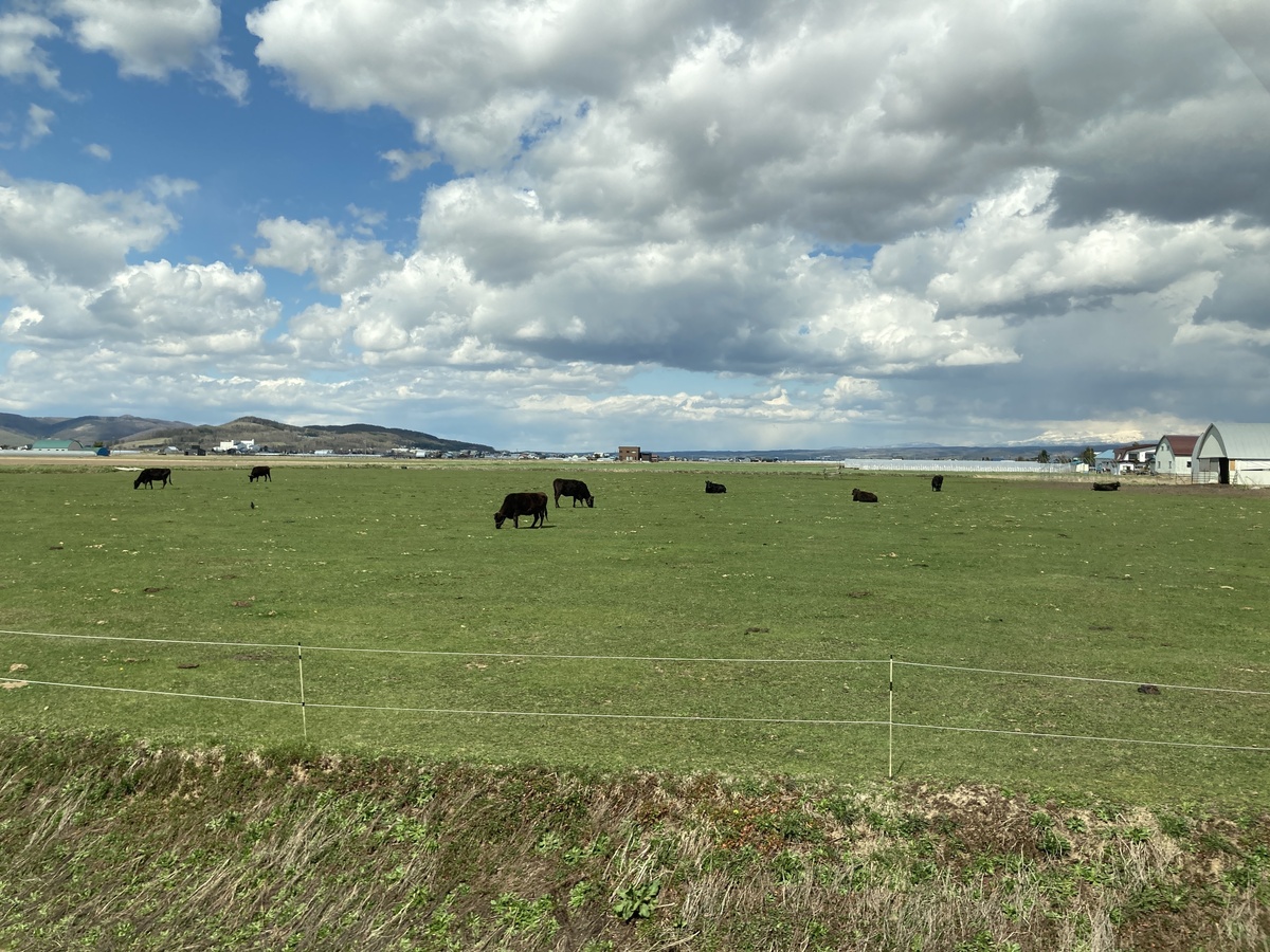 近くの農場では牛の放牧も見られ、北海道らしい風景が広がっています