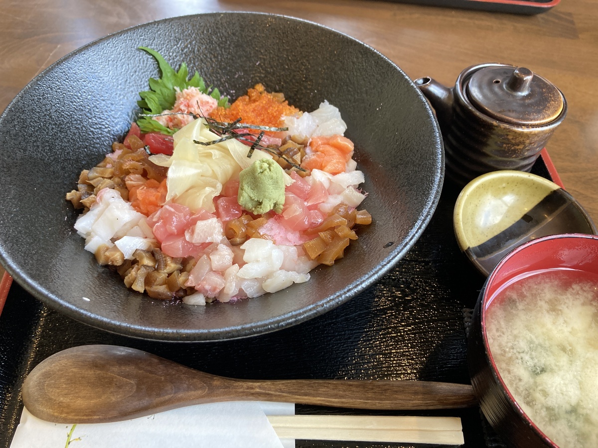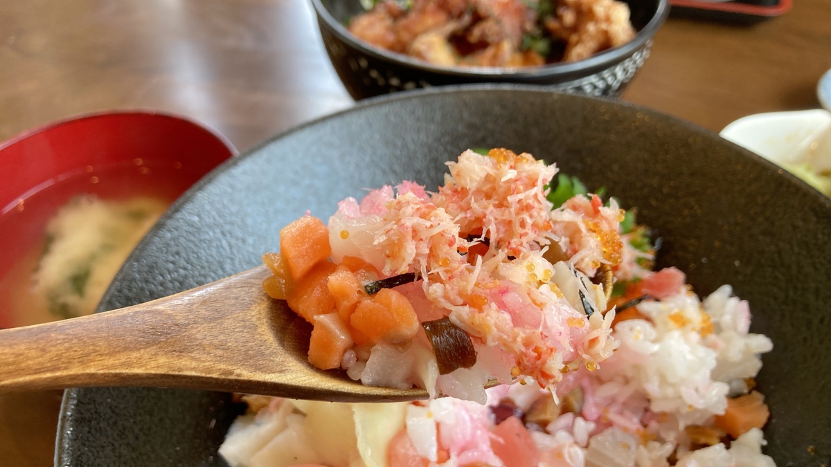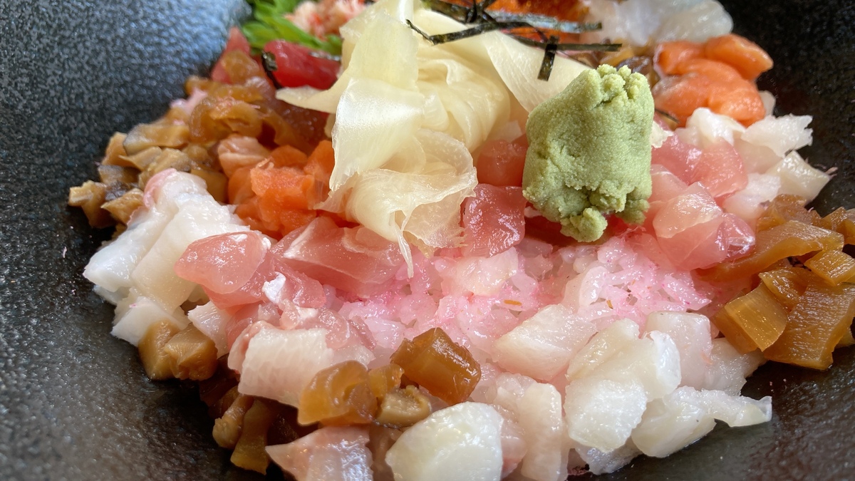 すし飯の上に、まぐろ・サーモン・白身魚・とびっこ・カニ・しいたけ・かんぴょうなどが細かく刻んで載っており、わさび醤油をかけてスプーンで混ぜながら食べる海鮮チラシ寿司。