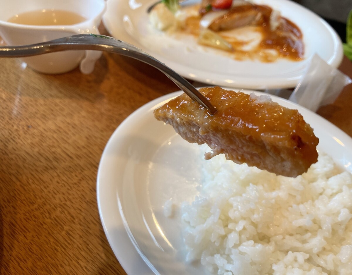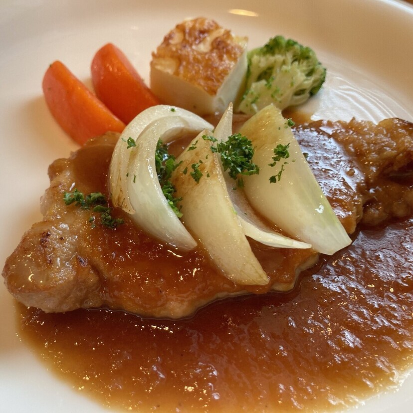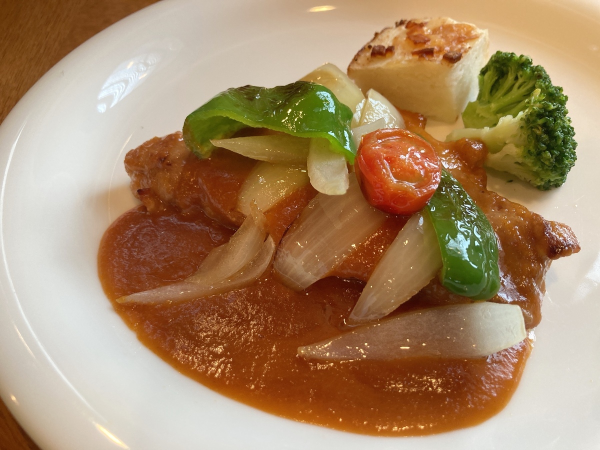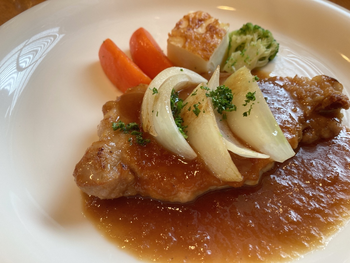 「ポークチャップ」は、柔らかくジューシーなお肉に上品なトマトソースが絡み、家庭で作るケチャップを使ったものとは一線を画す味わいでした。ニンニクの風味が効いており、レストランならではの味わいです。