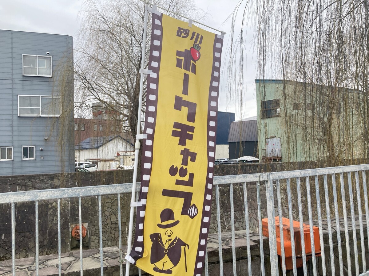 砂川名物「ポークチャップ」メニューがあるお店はこののぼりが目印