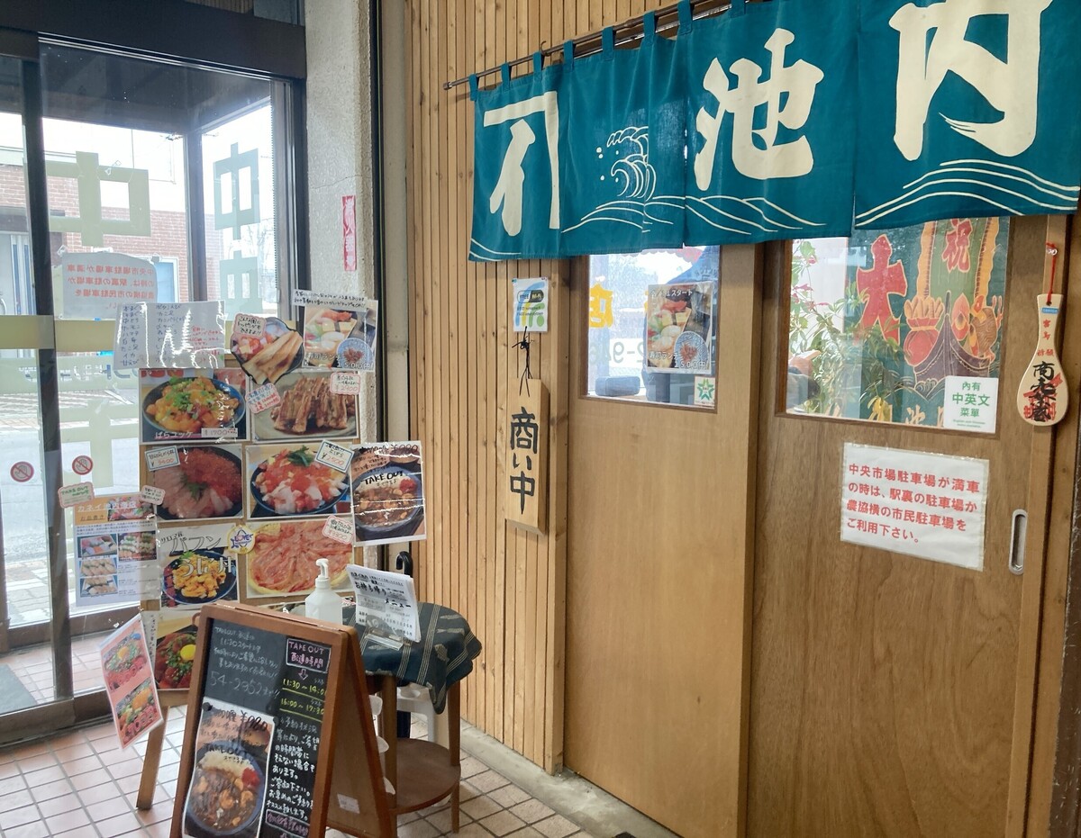 Peony Gardenの並びにある「中央市場」内に、鮮魚店「カネイ池内」が経営するどんぶり屋さんがあります。市場内は空き店舗が目立ちますが、その一角にあるどんぶり屋さんはとても明るく、きれいな店内です。