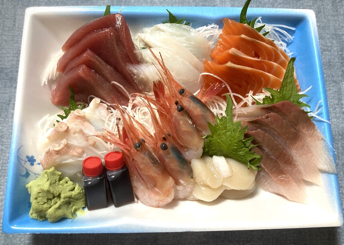 内容は、白身魚・ブリ・サーモン・タコ・甘エビ・ホタテ・マグロの7種類。自宅で酢飯に盛り付けて、海鮮丼として楽しみました。