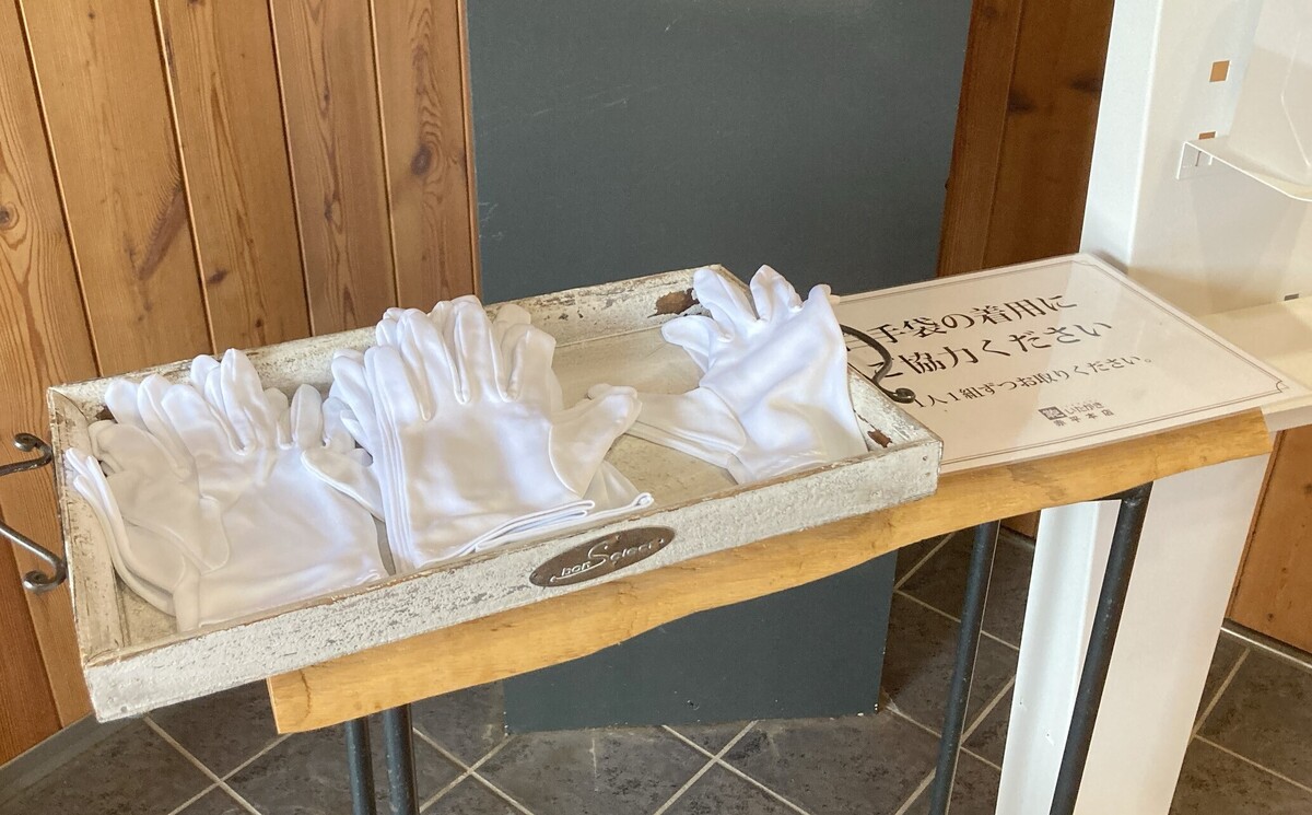 本店の建物は立派で、工房やカフェも併設されています。自動ドアを抜けると、製品に触れる際に手袋を着用するよう案内があります。