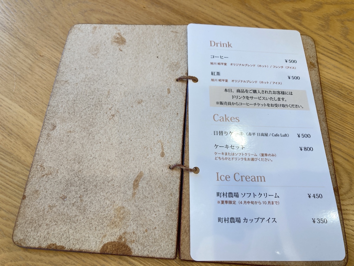 コーヒーと紅茶は旭川の「昭平堂」のオリジナルブレンド。地元・赤平市のケーキ屋さんのスイーツや、町村農場のアイス・ソフトクリーム(夏季限定)も楽しめるそうです。