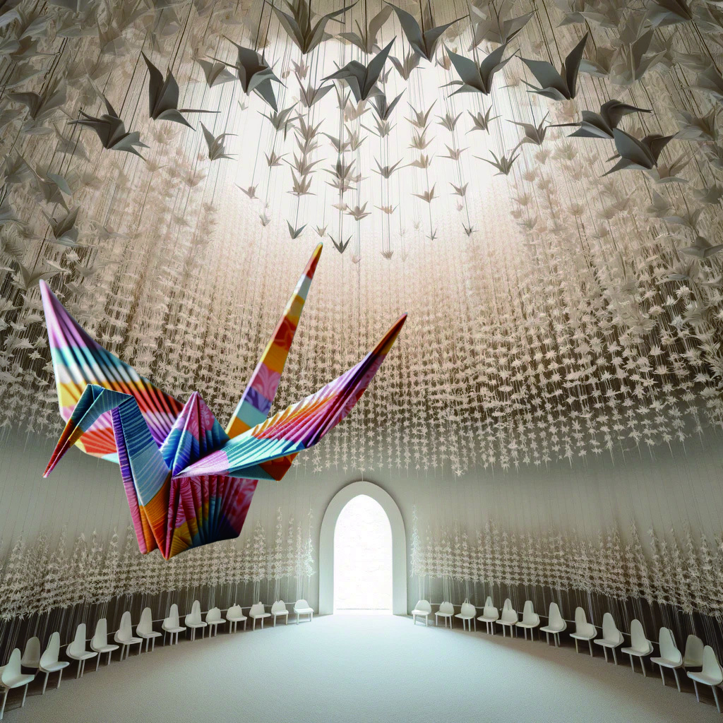 お菓子の包み紙で折られた「折り鶴」展示と、和洋様々なお菓子と北海道の広大な牧場や畑、農産物の迫力ある全天周映像空間による没入体験ができます。