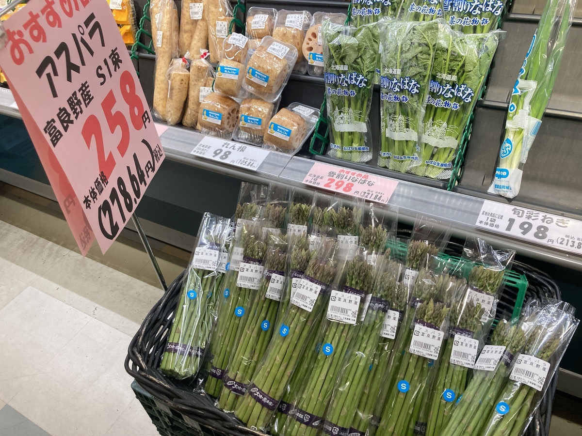 野菜類も安くて春先で全体的に野菜が高騰している時期にもかかわらず、全体的にリーズナブルな印象。富良野産のアスパラを購入しました。