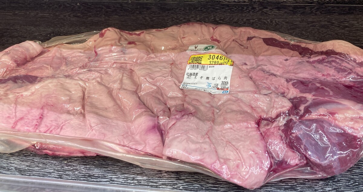 購入品 北海道産えぞ鹿ばら・肩肉切りおとし257円(税別)
