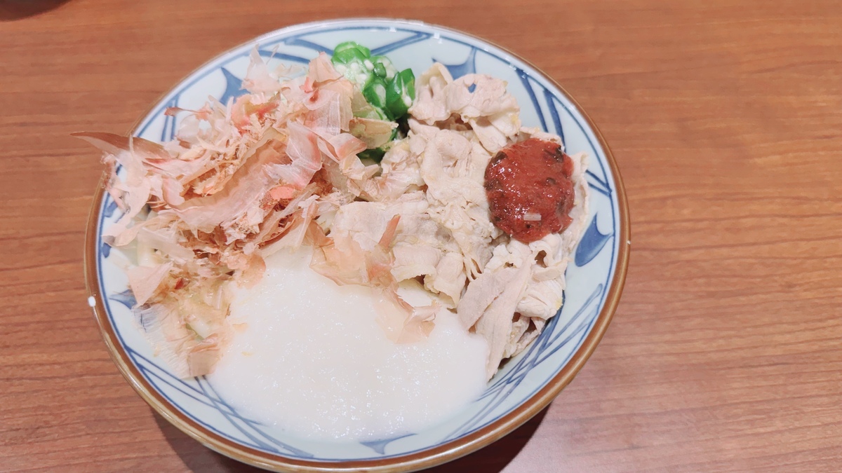 梅とろろ豚しゃぶぶっかけは特製出汁に漬け込んだ豚しゃぶが柔らかくて、味もついているのでうまみもありおいしかったです。