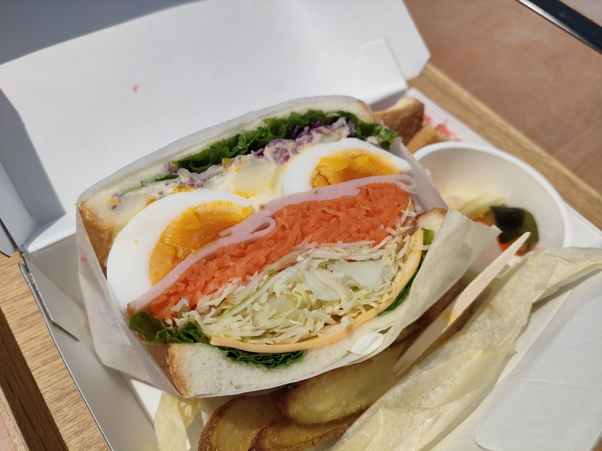 「萌サンド」はゆでタマゴやたくさんの野菜が入って彩りも良く、もちろんこのボリュームですので食べ応えも十分あります。