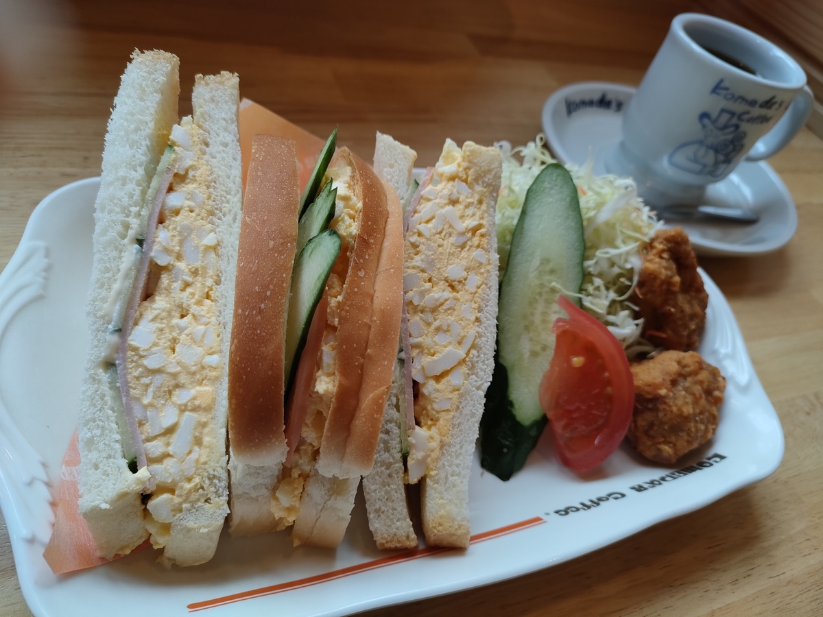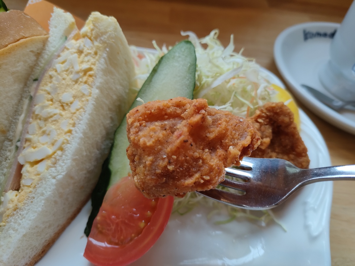 タマゴがたっぷり入ったミックスサンドにしっかりとサラダが添えられていて、そこへコメチキが2個も入ってくるんですから、ずいぶんお得なランチプレートじゃないでしょうか。