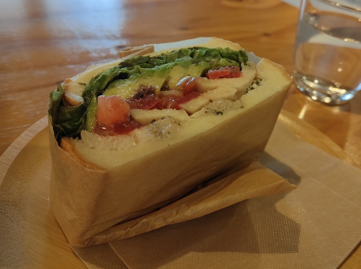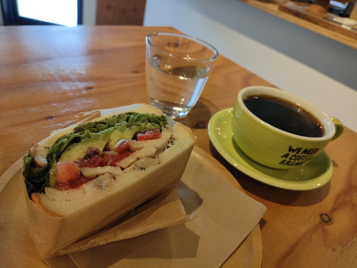 今回は「サルサチキンサンド」のハーフ(税込500円)と「グアテマラコーヒー」のホット(税込650円)をオーダーさせて頂きました。