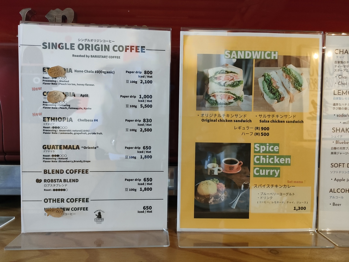 メニュー表は写真の通りで、サンドウィッチはレギュラーサイズとハーフサイズから選ぶことができます。