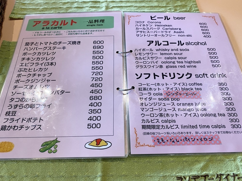 数日前に、ランチで「オムライスハヤシ」を食べた時に、メニューはチェック済み。お酒もお酒にあうおつまみもメニューにあるのです。