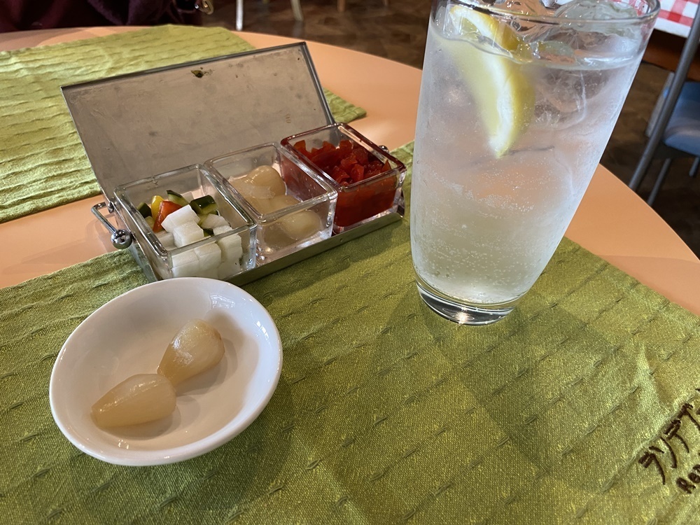 まずは、カラカラの喉を湿らすために「レモンサワー」を注文。一緒に運ばれてきたのは、カレーの薬味のラッキョウや福神漬け、ピクルスです。