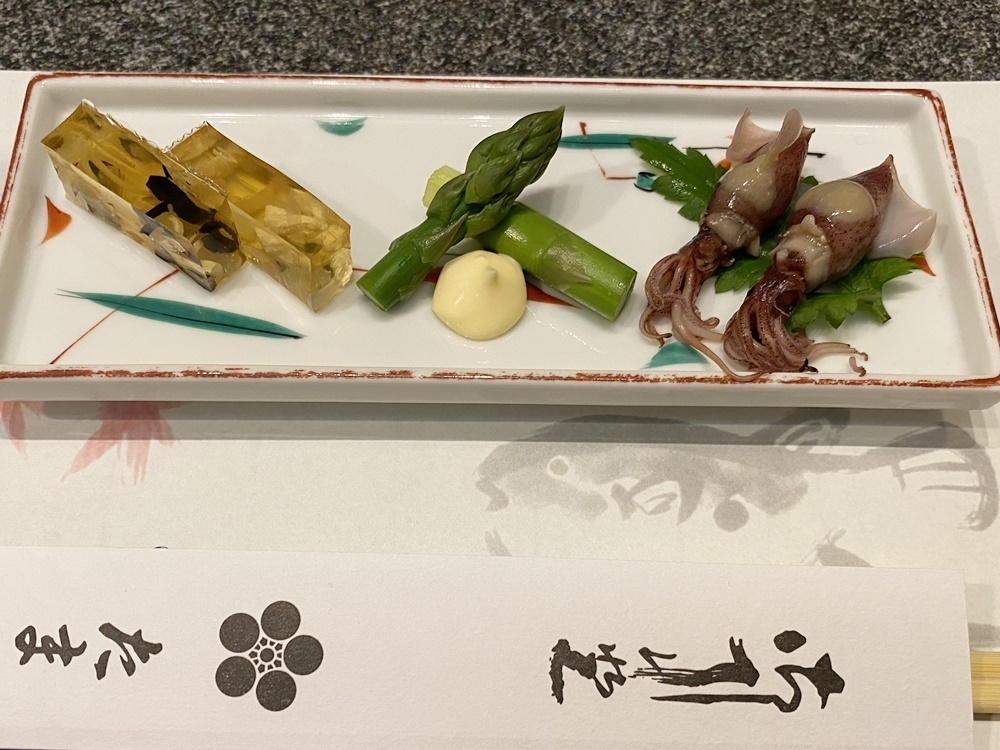 お通しとして出てきたのは、ふぐの皮の煮凝りと旬のアスパラガス、そしてホタルイカの酢味噌和え。旬の素材を使い、美しく盛り付けられています。
