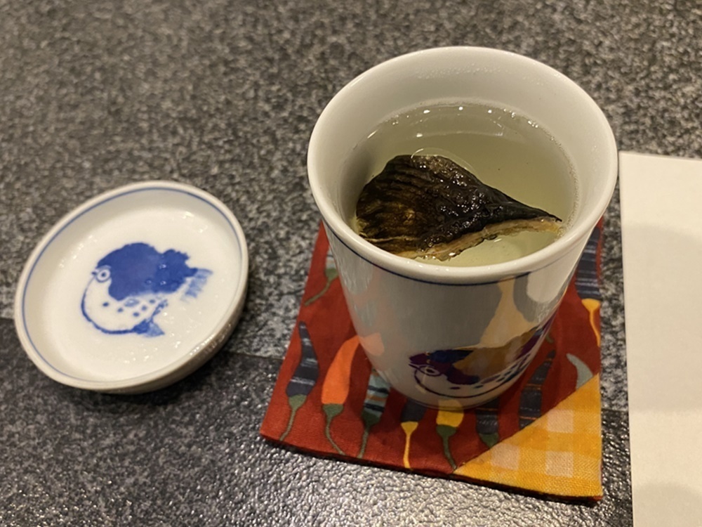 折角、ふぐ料理のお店に来たので飲むのは「ひれ酒」。ふぐひれの香ばしい風味が日本酒に移って、なんとも深い味わいです。