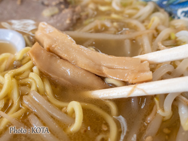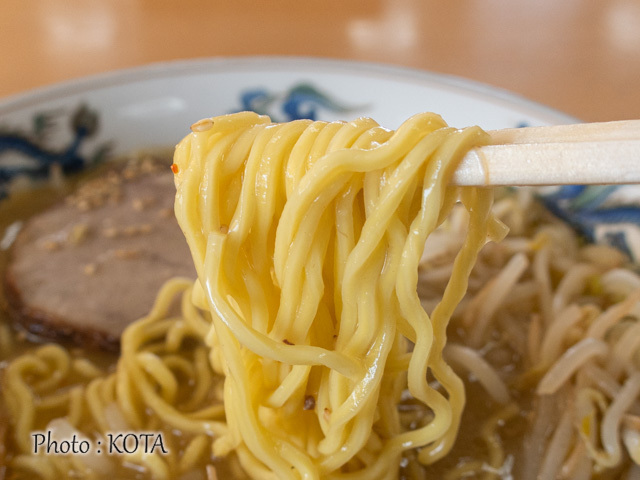 麺は、旭川ではお馴染みの低加水仕様。ちぢれ控え目な細麺はしこしことしていて、喉越しを楽しませてくれる。