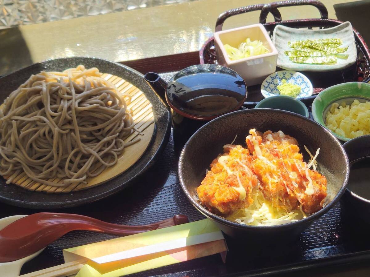 豊富な薬味付きの蕎麦と唐揚げ丼がセットになったボリューミーなメニュー。