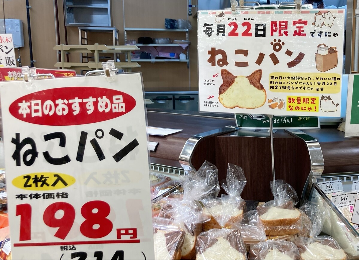 お惣菜コーナーで見つけたのは、思わず笑顔になるかわいらしい猫ちゃんの形の食パン。毎月22日、「にゃんにゃんの日」にだけ登場するレア商品です。