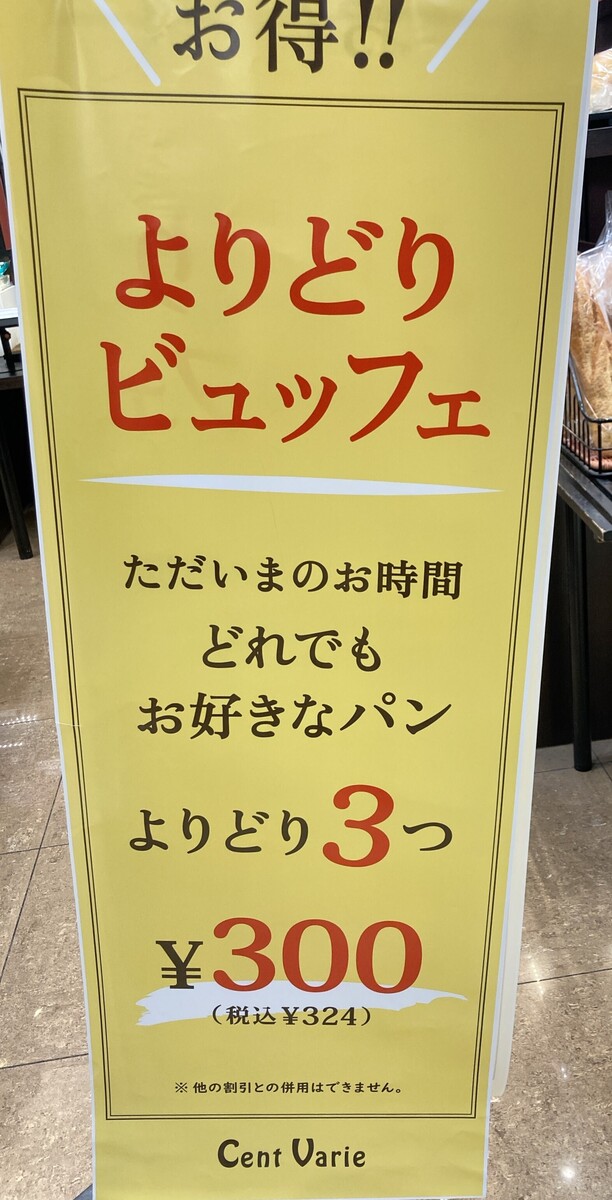 どれでもお好きなパンを3つ選んで、たったの300円(税別)。パンはもともと130円~180円台が中心なので、かなりお買い得。店頭にはまだまだ種類豊富に並んでおり、スーパー入口近くにあるので買い物客がどんどん集まってきます。