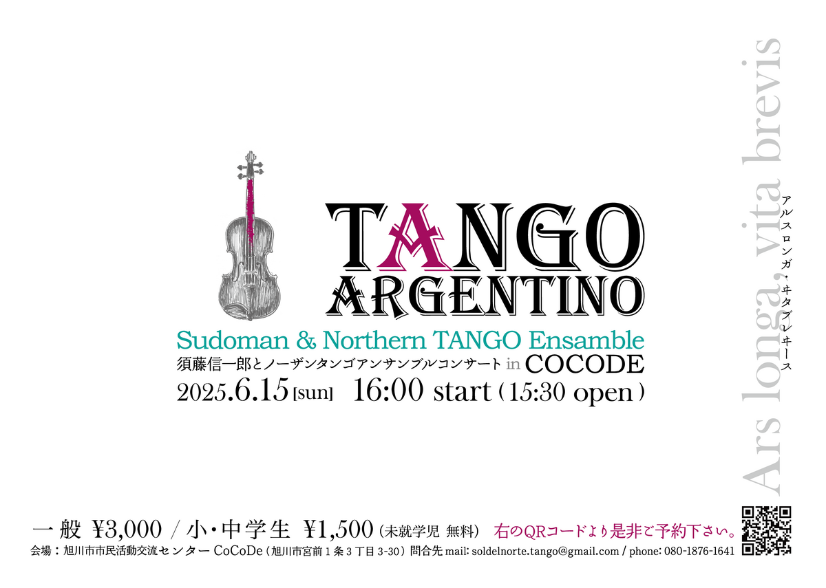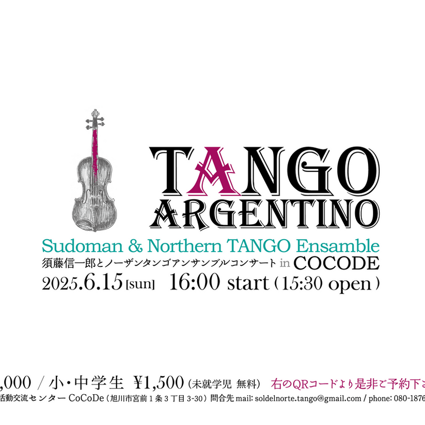 2025年6月15日(日)に旭川市市民活動交流センターCoCoDeで『須藤信一郎とノーザンタンゴアンサンブルコンサートinCOCODE』が開催されます。