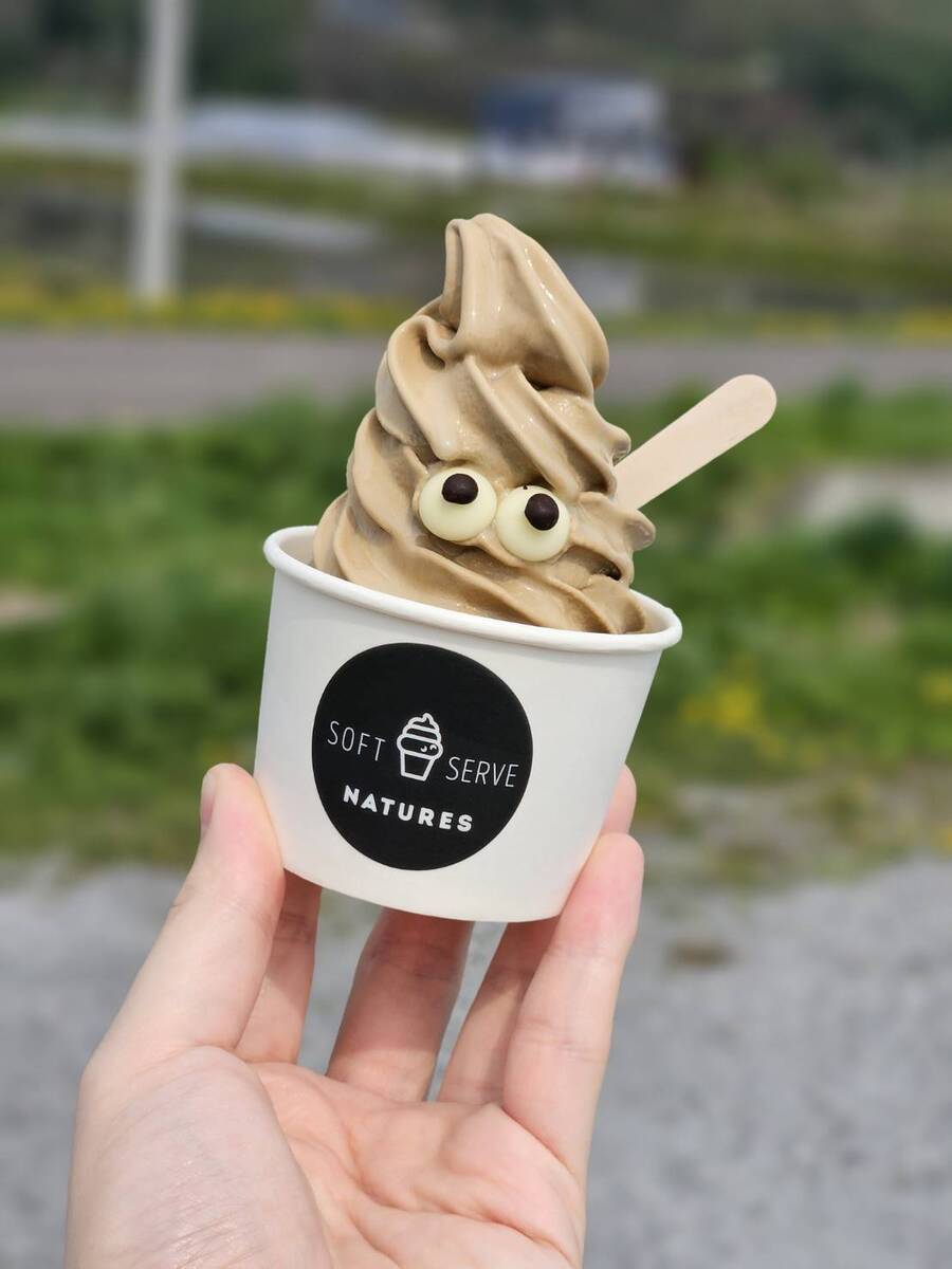 目になったチョコレートがトッピングされていてとっても可愛いソフトクリーム♪