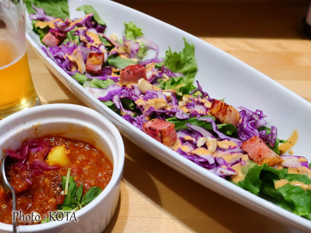 香ばしいベーコンと甘酸っぱいソースに、ビールが進む。野菜はやや小さめにカットしてあるので、ツマミ的に食感が良好。