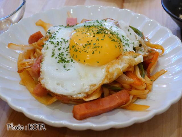 面白いなと思ったのが、上の『沖縄ナポリタン』(600円)。目玉焼き(150円)をプラス。