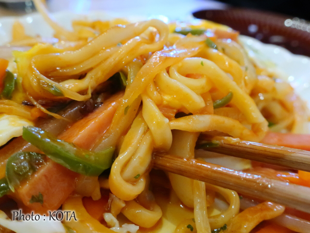 かの有名な「沖縄そば」の麺をナポリタン仕立てで調理したというシロモノ。同店のオリジナルだ。