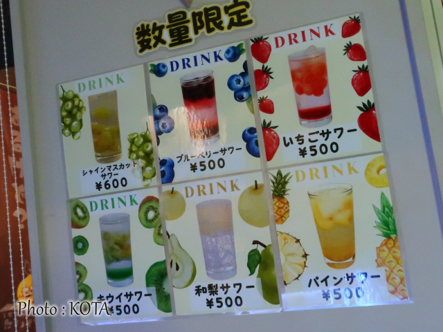 ドリンク類はほかに、あらごしフルーツサワー各種(各600円)や、上の数量限定ドリンクも。