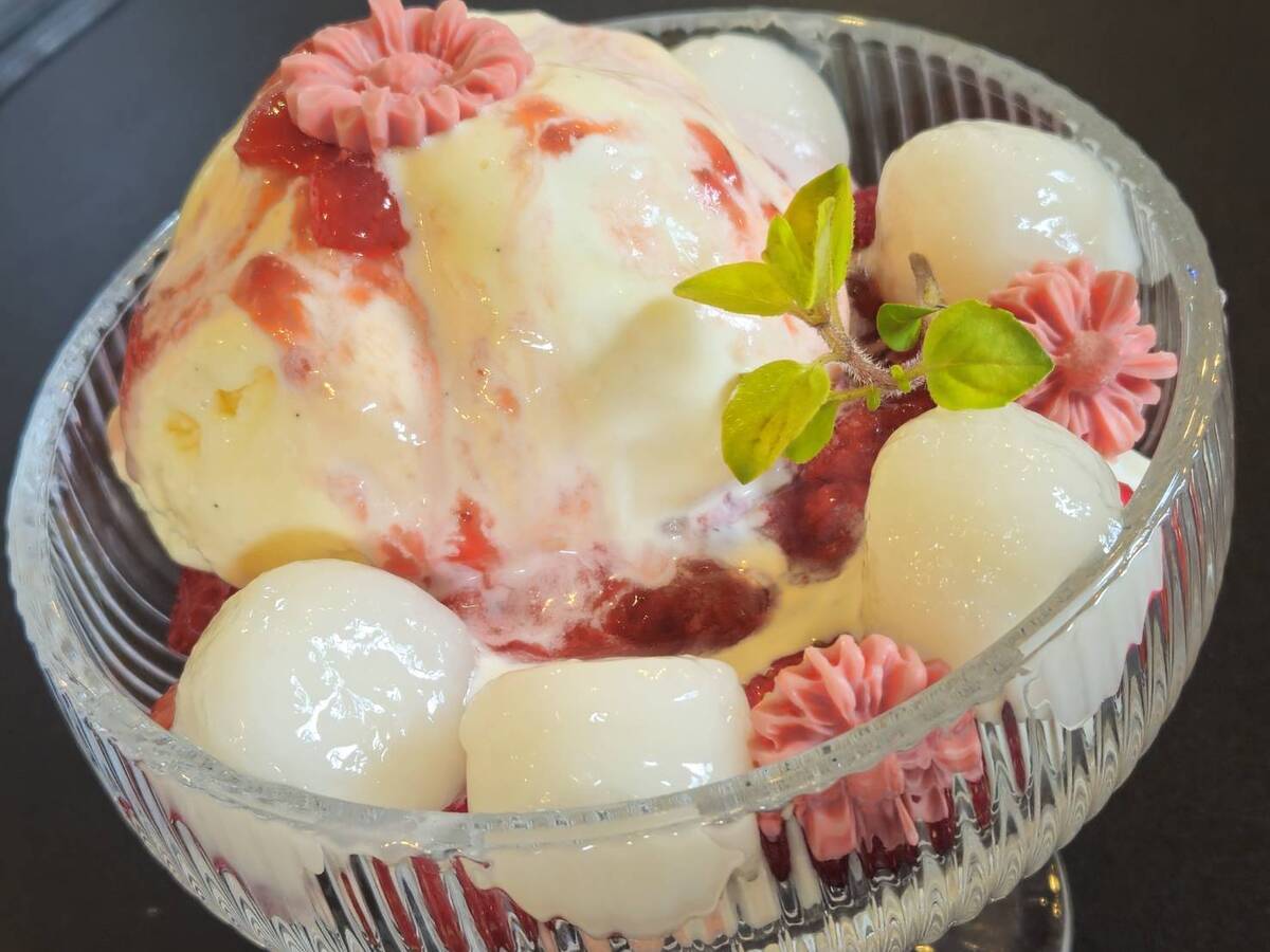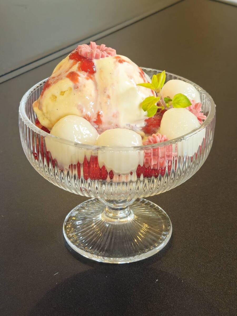 口の広いグラスに盛られたいちご、白玉、アイスが見た目も可愛らしく演出してくれています。