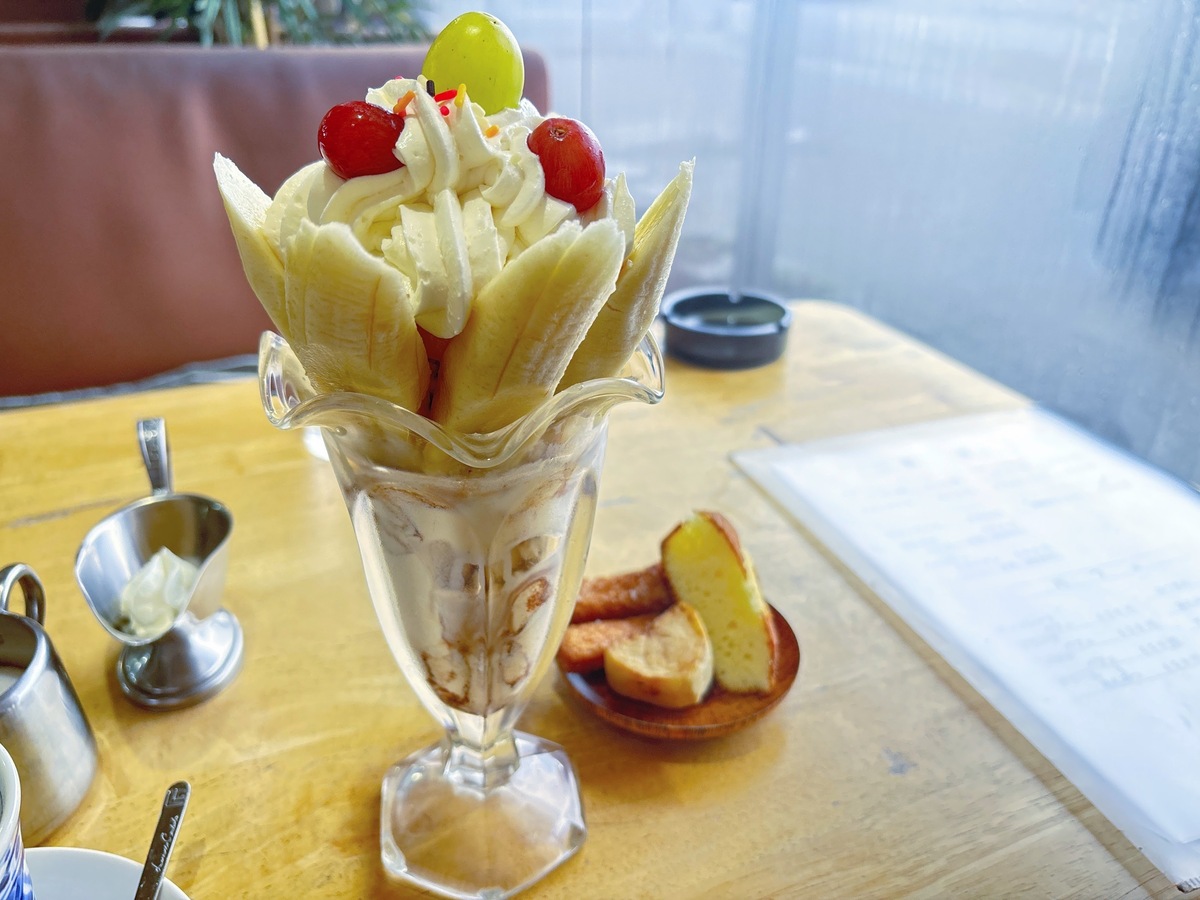 バナナとクリーム、ぶどうがのった大盛りパフェはやっぱり大きかったです。