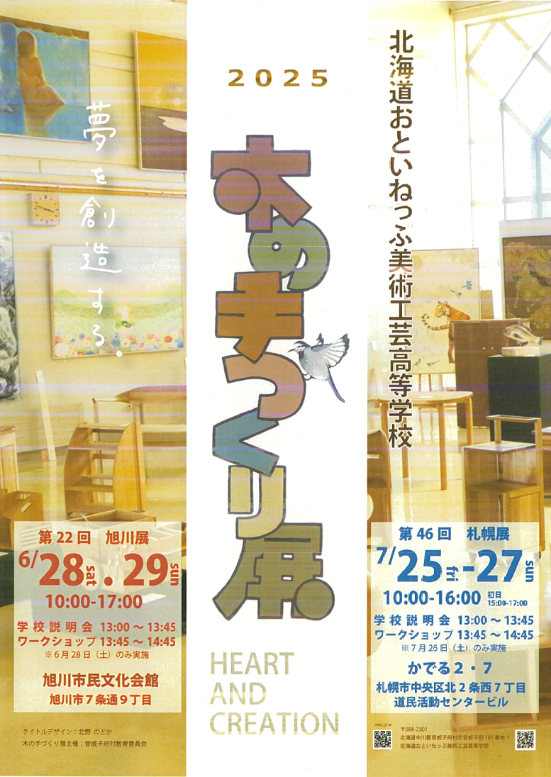 北海道おといねっぷ美術工芸高等学校によるイベントで、生徒作品の展示や教育活動のパネル展示のほか、会場内にて学校説明、ワークショップも行われます。