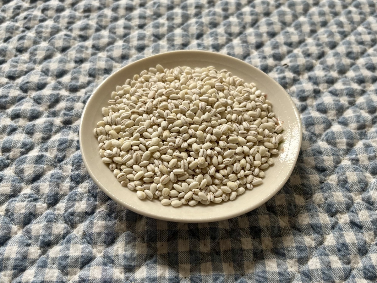 写真はもち麦50グラムで、白米1合に加えて炊飯すると、おいしいもち麦ごはんの完成です。
