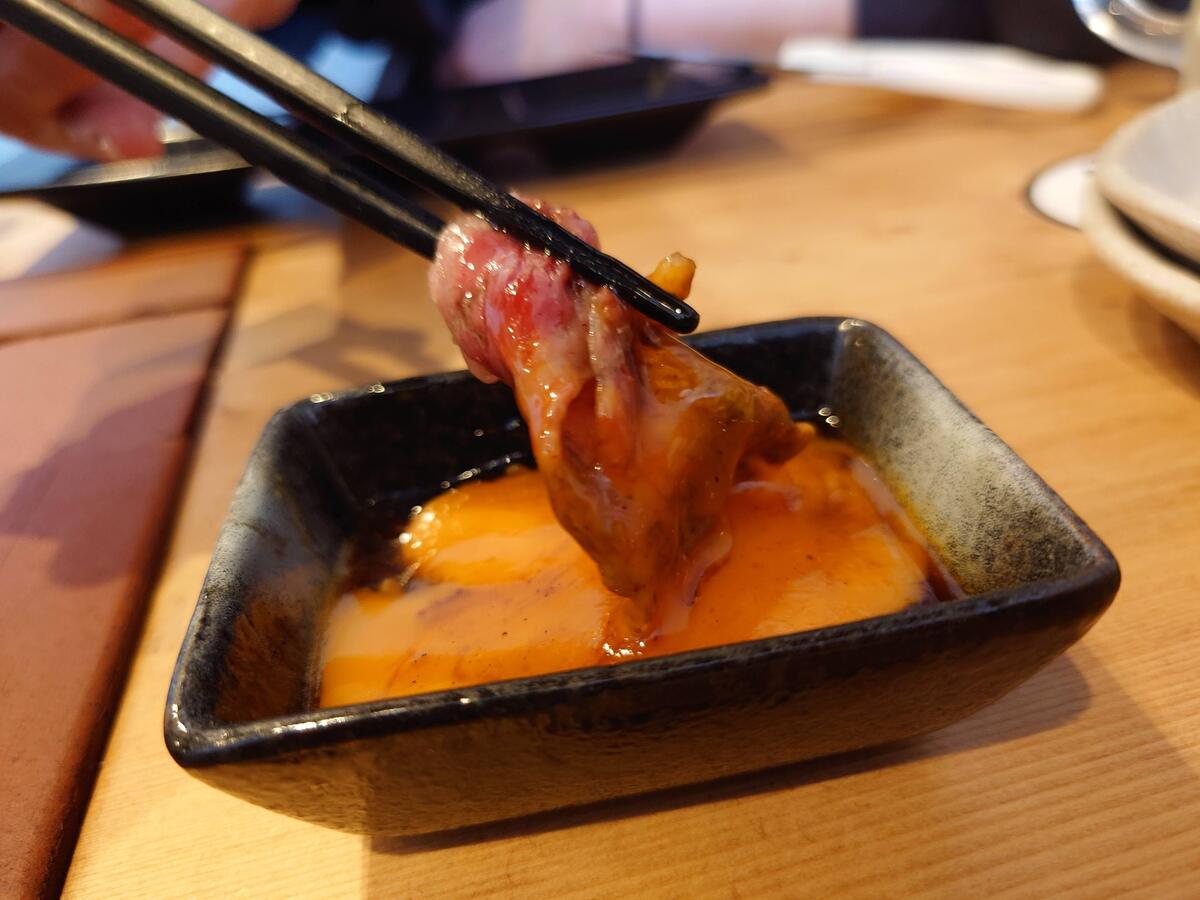 和牛サーロイン焼きしゃぶ(卵黄付)1280円。