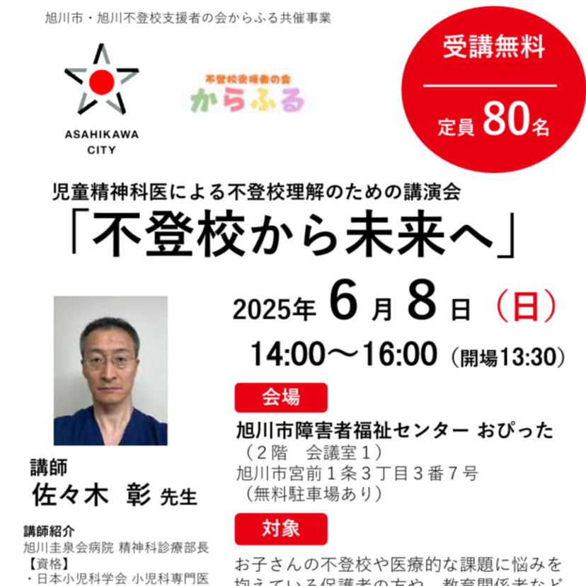 2025年6月8日(日)に旭川市障害者福祉センターおぴったで『児童精神科医による不登校理解の為の講演会開催 不登校から未来へ』が開催されます。