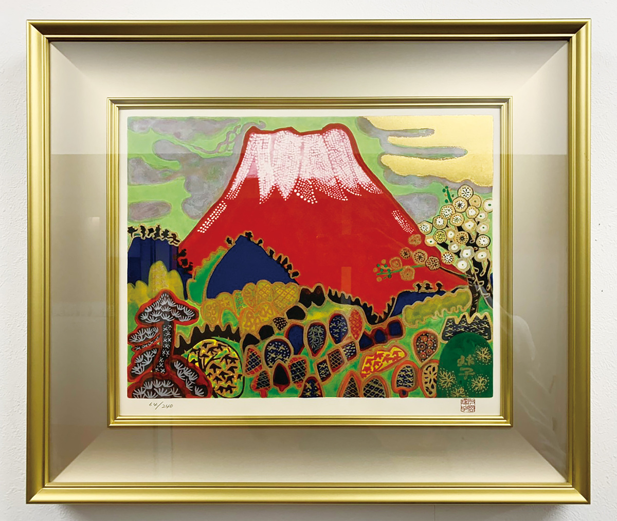 【富士山】 50歳を過ぎてから描き始め、生涯にわたり様々な表情の富士山を描き続けました。特に「めでたき富士」シリーズは、見る人に勇気や希望を与えるとして人気があります。