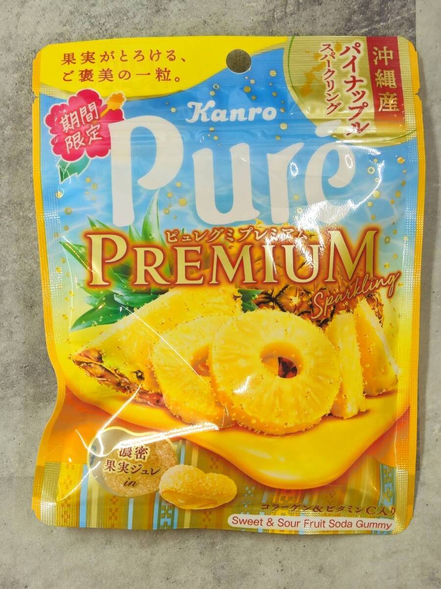 カンロの人気商品ピュレグミのプレミアム版で、季節限定のパイナップルスパーリング味。