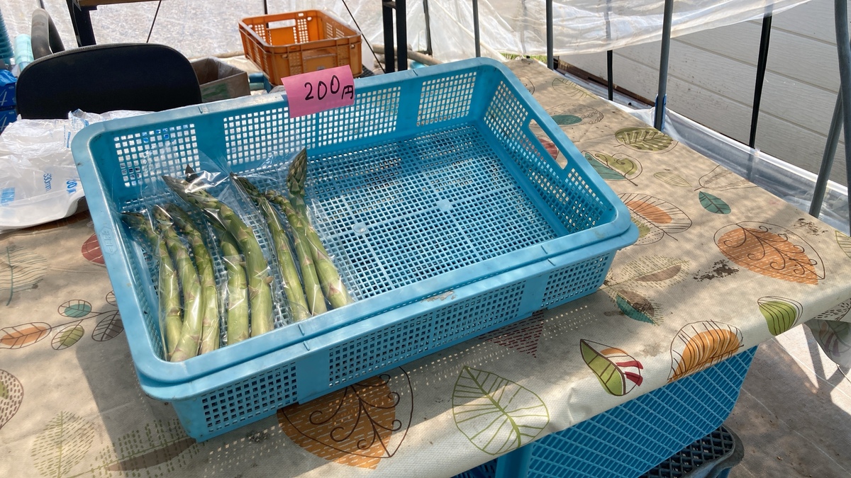 スーパーでは本州産のししとうが多く見られますが、地元産のししとうに今シーズン初めて出会いました!色ツヤが全然違って、とっても新鮮そうだったので迷わず購入。他にも、太くて立派なアスパラがあり、どれも1袋200円(税込)とお手頃でした。夏にはメロンやとうもろこしも並ぶそうなので、今後も楽しみです♪