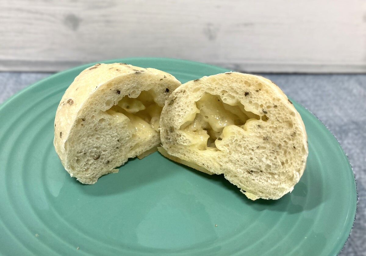 プチパンが4つ入り。もちもちで、チーズの塩気とバジルの風味が効いています。シンプルなパンなので冷凍保存にも向いています。