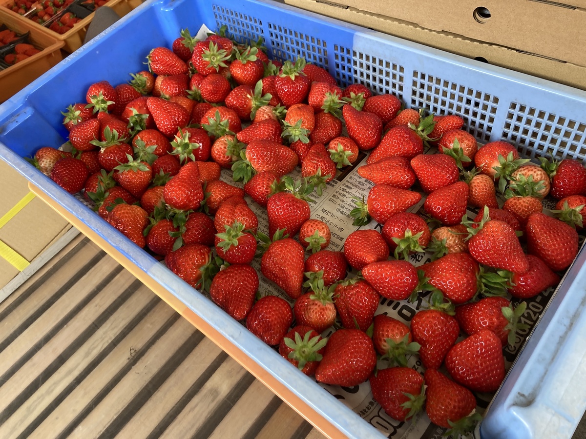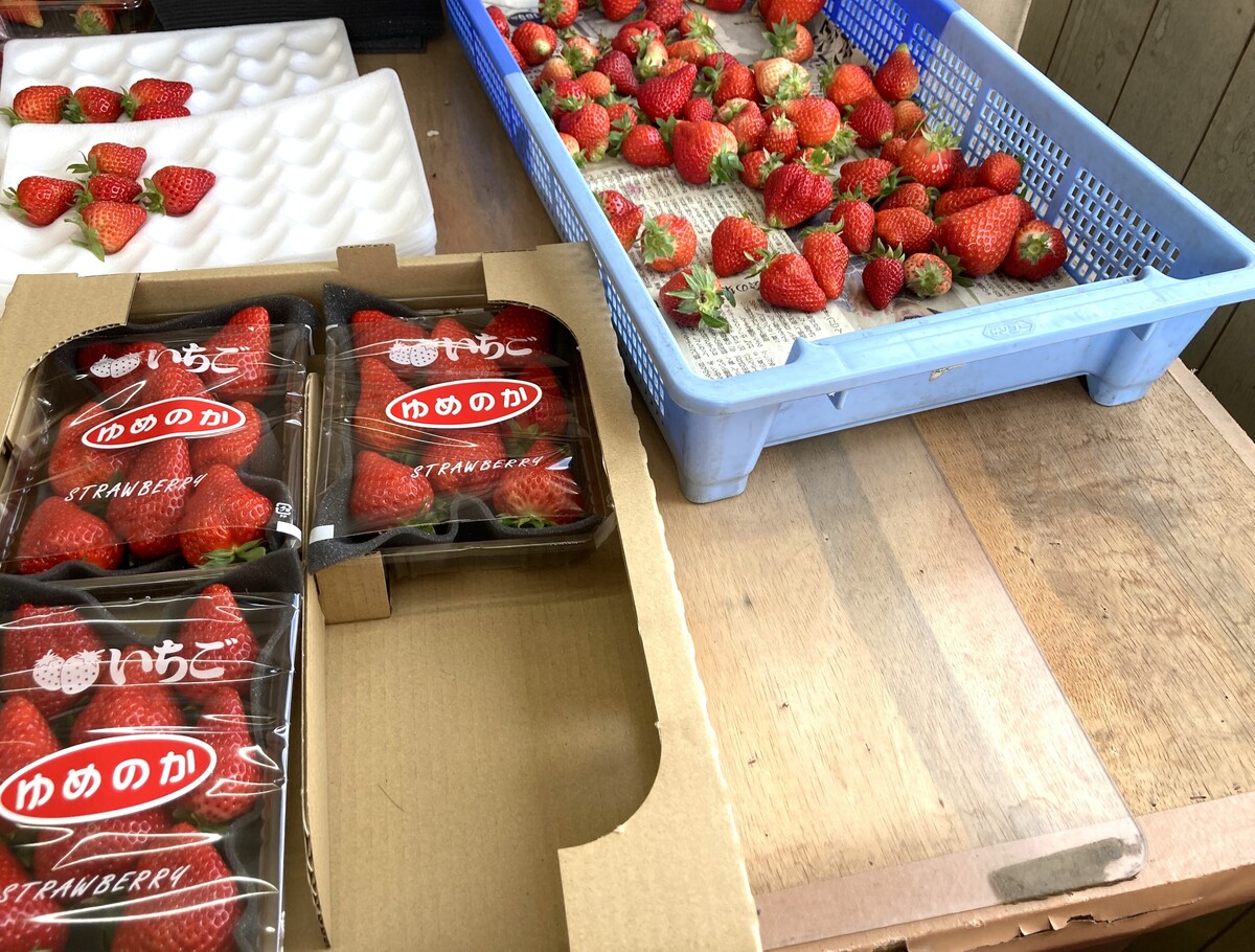 直売所内ではいちごのパック詰め作業中で、甘い香りが漂っていました。今年も「ゆめのか」という品種のいちごが販売されており、1パック750円(税込)。昨年より50円値上がりしましたが、大粒で甘く、新鮮なので値段以上の価値があります!