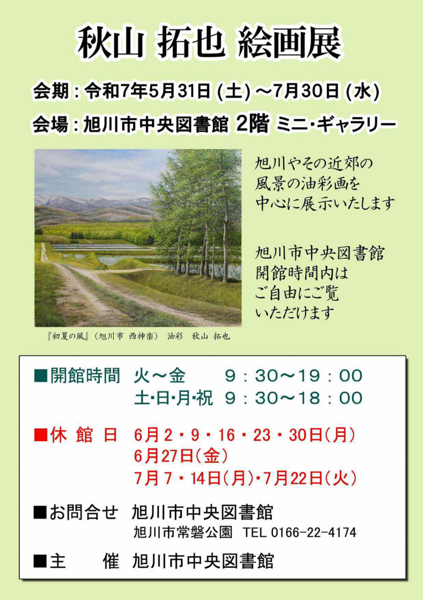 2025年5月31日(土)から7月30日(水)まで旭川市中央図書館で開催される『秋山拓也絵画展開催』のご紹介です。