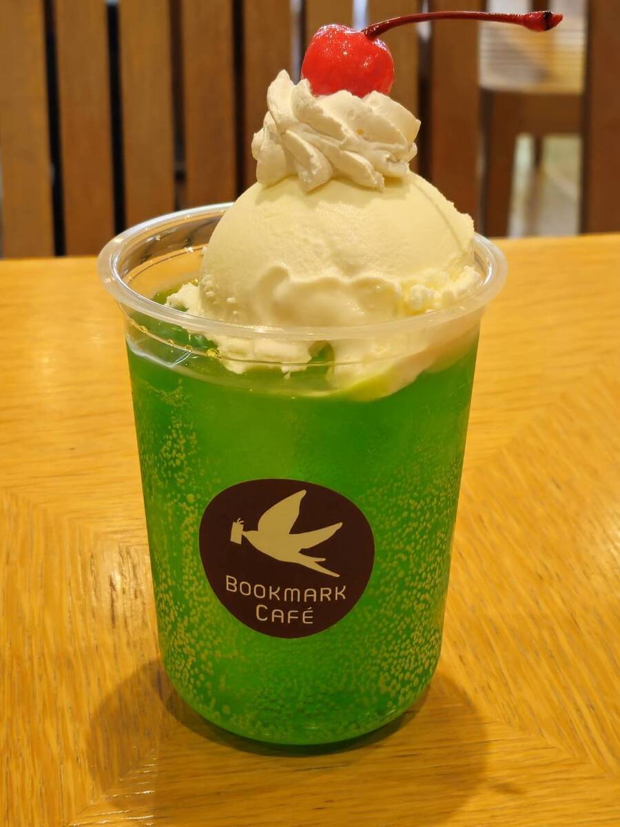 メロンソーダの上にアイスクリーム、ホイップ、さくらんぼと間違いないビジュアルの良さ!