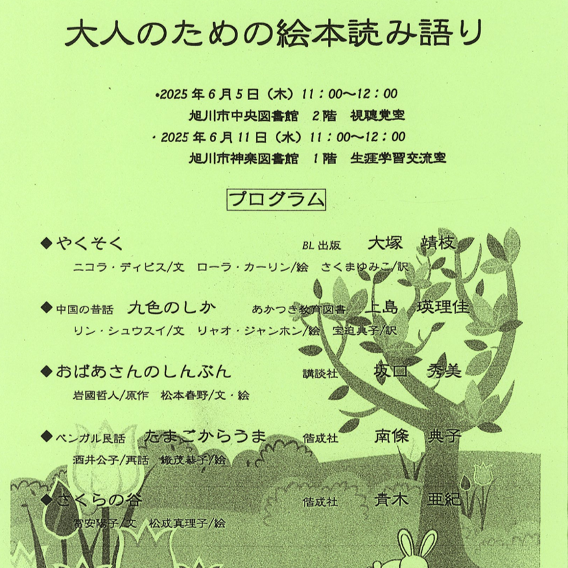 2025年6月5日(木)に旭川市中央図書館で『大人のための絵本読み語り』が開催されます。