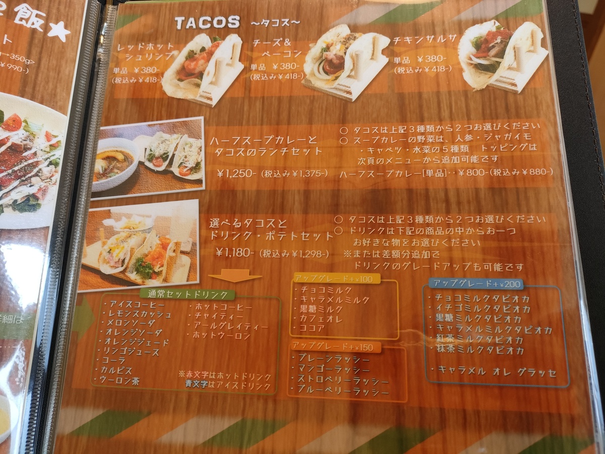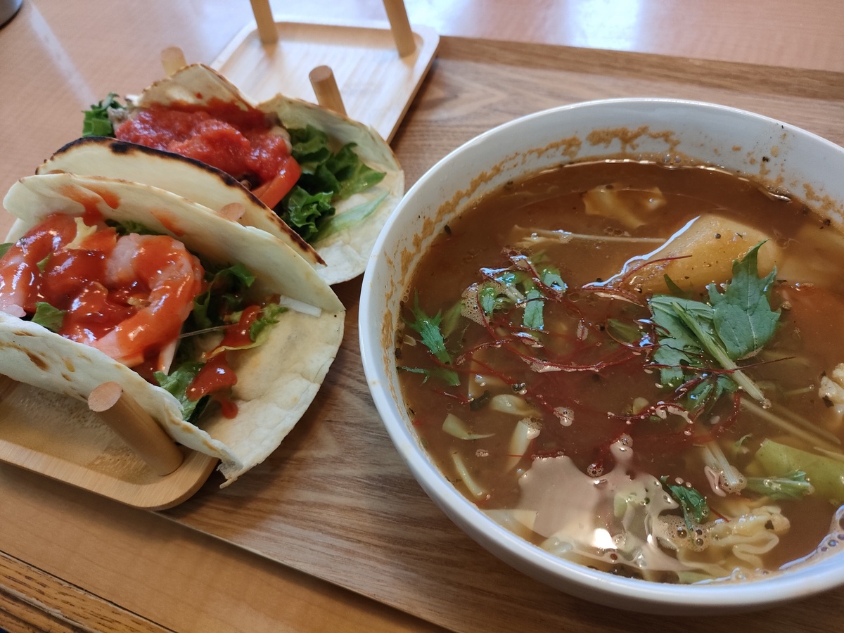 今回は「ハーフスープカレーとタコスのセット」1250円(税込1375円)をオーダーさせて頂きました。