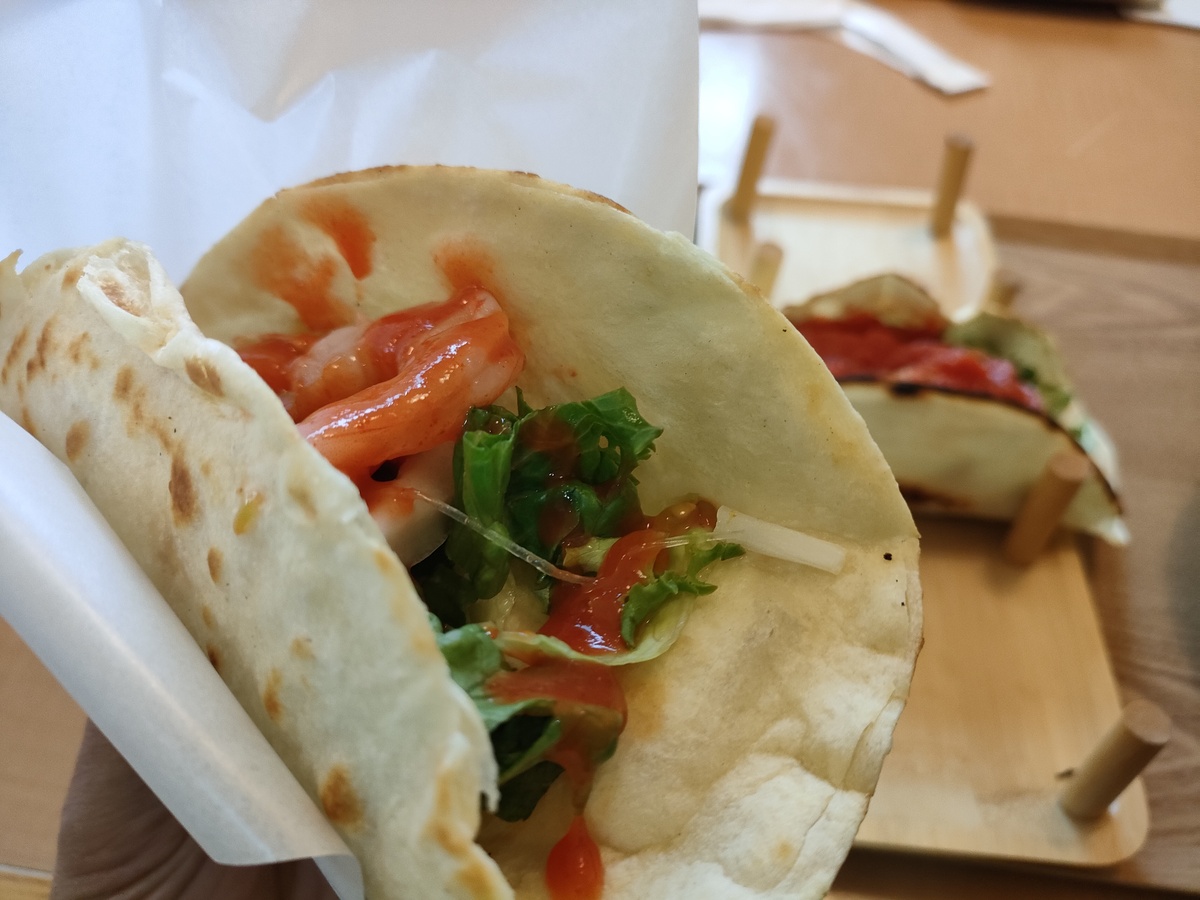 レッドホットシュリンプのタコスは名前の通り、いかにもホットチリといったピリッとしたスパイスが効いていて辛めの味付け。