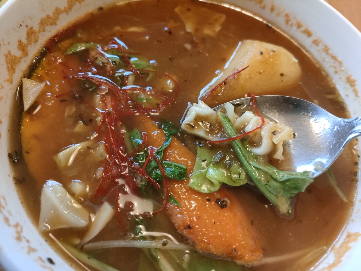 そして、野菜たっぷりのスープカレーはほど良い辛さで食べやすく、スパイシーさも十分に味わえます。