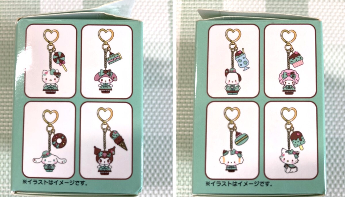 登場キャラは「キティ・マイメロディ・クロミ・こぎみゅん・シナモロール・ポチャッコ・チャーミーキティ・マイスイートピアノ」の8種類。それぞれチョコミントカラーのスイーツチャーム付きでとってもキュート!
