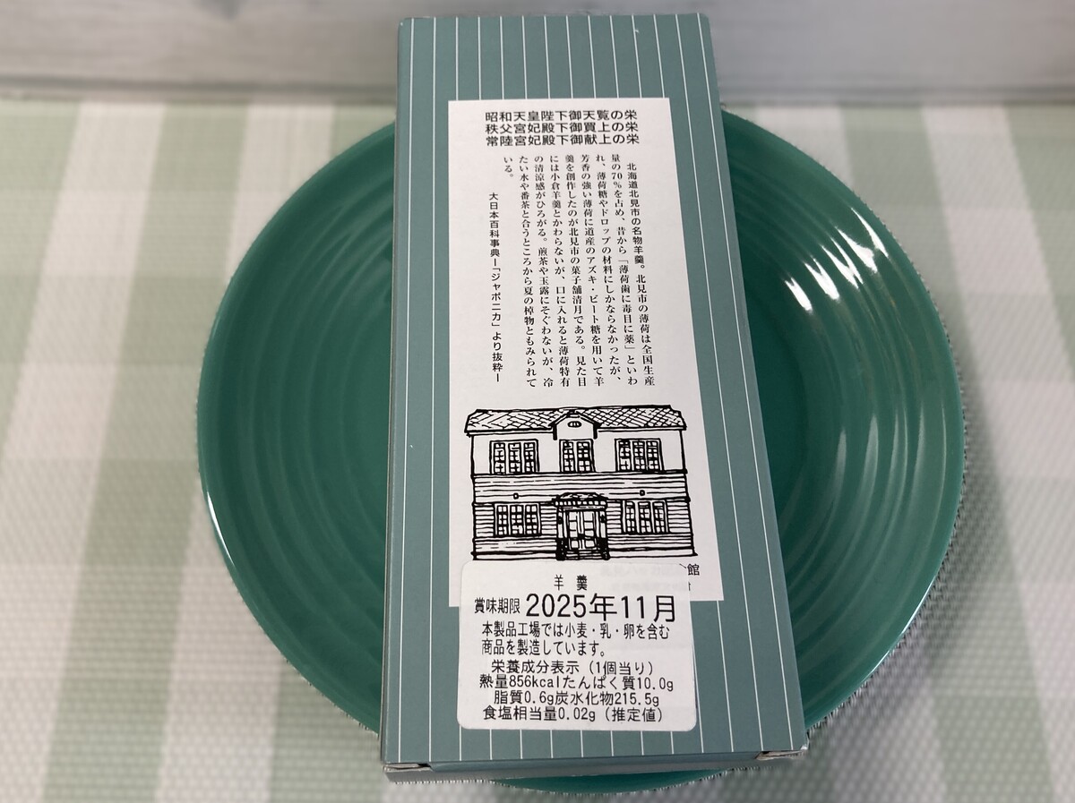 見た目はごく普通の羊羹と同じですが、北見産の和ハッカを使用しており、メントール感はやや強め。でも香りは控えめで、食べやすさも◎。